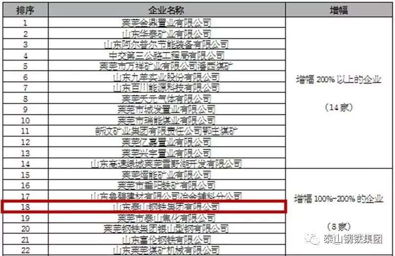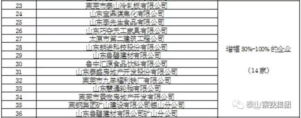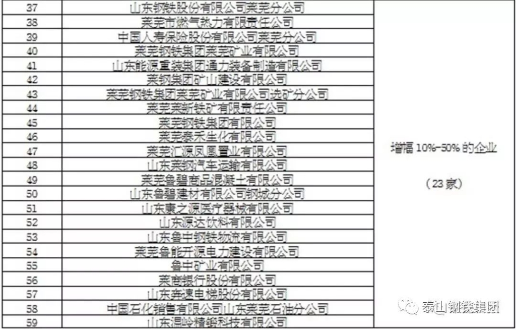 莱芜市2017年度纳税百强企业增幅排行榜