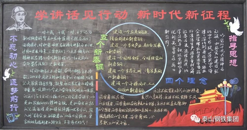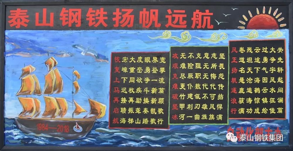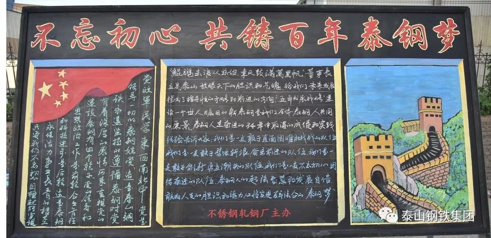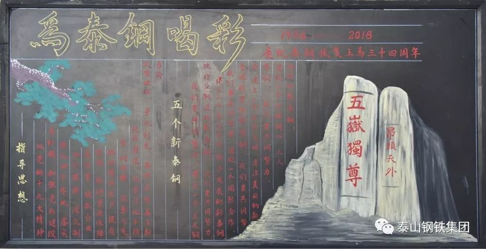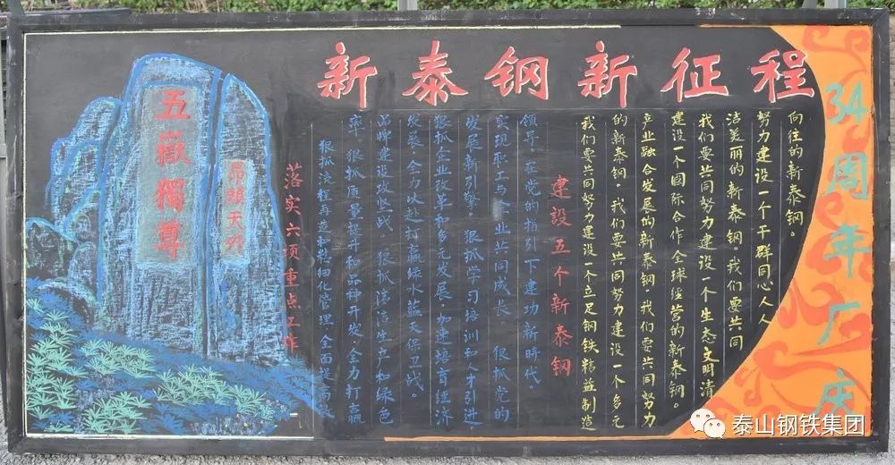 但是,泰山钢铁集团的钢铁汉子们不仅能百炼钢,亦能绕指柔!今年4月20日是泰山钢铁集团恢复生产34周年纪念日,为庆祝这一历史时刻,回顾和讴歌34年的创业历程,自4月18日起,泰山钢铁集团开展了黑板报展评庆祝活动。来自分厂、部室的钢铁汉子们纷纷用手中的画笔为这幸福的日子粉刷彩色的祝福……