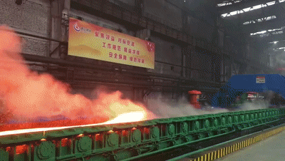 (火红的钢坯正在轧道上飞驰)