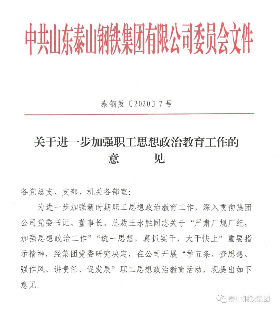 为深入贯彻王书记的重要指示精神,做好新时期职工思想政治教育工作,3月16日,党委副书记、工会主席杜跃进组织部分基层党组织和政治部的相关同志召开了讨论会,研究具体的落实措施。随后,集团公司党委下发了《关于进一步加强职工思想政治教育工作的意见》,在全公司内开展“学五条、查思想、强作风、讲责任、促发展”职工思想政治教育活动,正式吹响了泰山钢铁掀起新一轮思想政治教育的“进军号”。