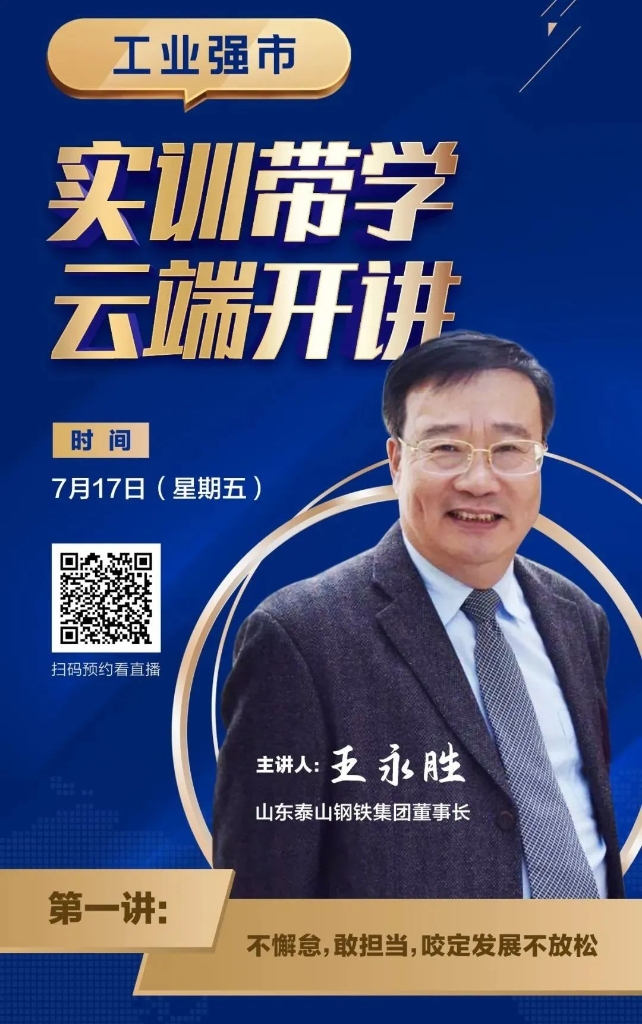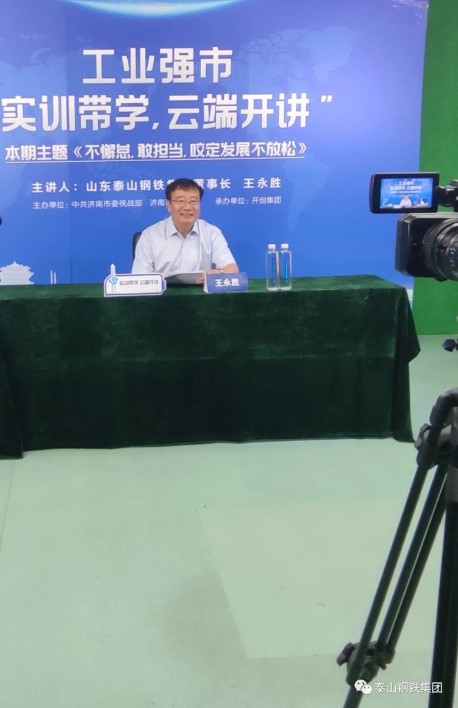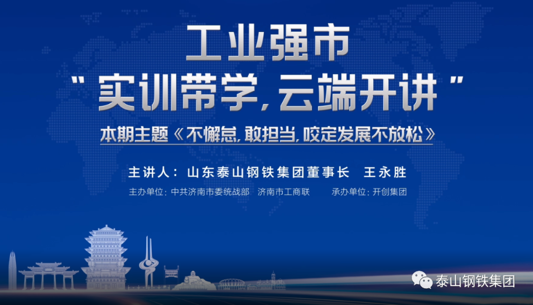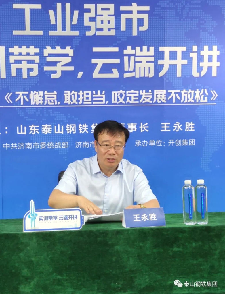 为深入贯彻《关于实施省会民营企业家素质能力培养提升工程的意见》,大力推进全市工业强市战略的实施,7月17日,市委统战部、市工商联开展实施“实训带学,云端开讲”活动,运用线上平台,邀请部分知名企业家,举办系列专题讲座。泰山钢铁集团董事长、党委书记、总裁王永胜作为首讲人,做了题为《不懈怠,敢担当,咬定发展不放松》的专题讲座。