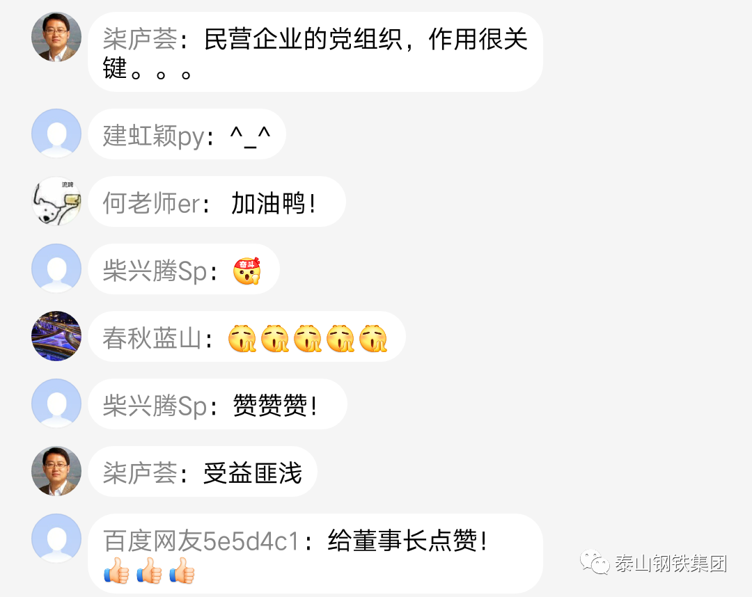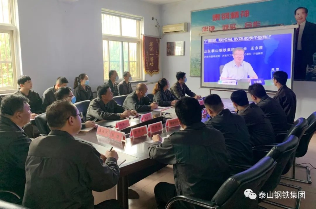 王董事长从坚持党的领导不动摇、咬定发展不放松、全心全意依靠职工办企业、与时俱进抓学习、坚守本分干实业五个方面谈了泰山钢铁集团的经验做法。