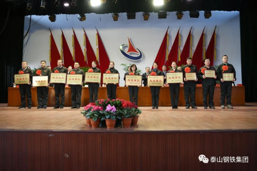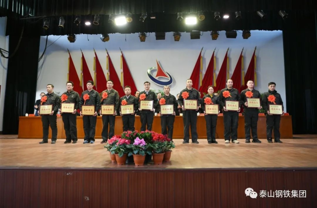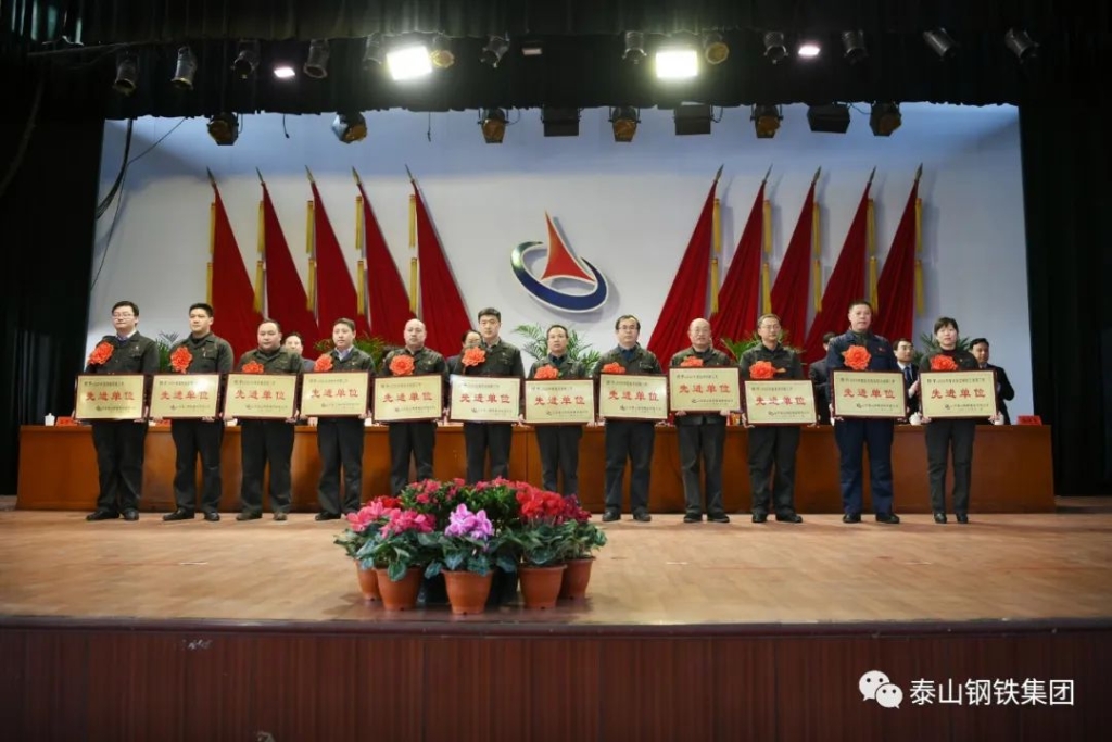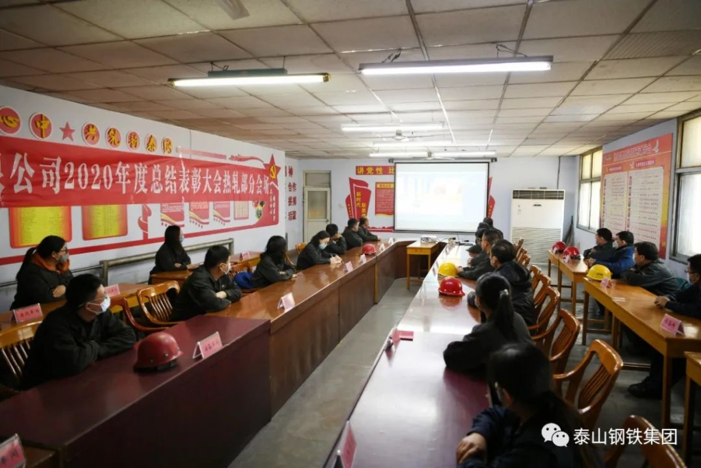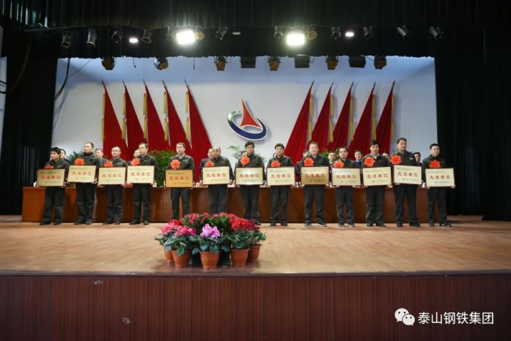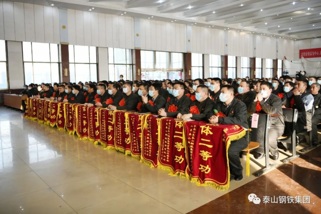 中心会堂内灯光璀璨,气氛庄重。悬挂在主席台正中的“泰山钢铁”标志熠熠生辉,十面鲜艳的红旗分列两侧。主席台台上,绿植青翠、鲜花娇艳。主席台上方,“山东泰山钢铁集团有限公司2020年度总结表彰大会”的会标,在灯光的辉映下格外醒目。