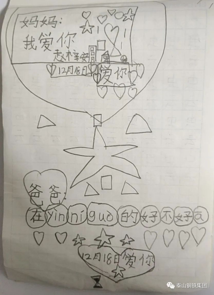 对家人,他们柔情满怀。工作之余,偶尔到码头上,眺望着家的方向,思乡之情,油然而生。赵伟说让他最感动的一件事就是儿子很用心地给他画了一幅贺卡,由于儿子刚上小学一年级,识字不是很多,他在贺卡上写着:“爸爸,你在印尼还好吗?”虽然只有短短的一句话,但却是儿子最纯真的表达。当赵伟在视频中看到这张贺卡时,禁不住热泪盈眶,言语也有些哽咽了。无独有偶,李孝云有两个儿子,由于他们的联系方式只能是通过手机来进行,所以儿子就写了一篇日记,题目是:《住在手机里的爸爸》。每次和家人联系,曾国峰和刘磊也都是报喜不报忧,说在印尼挺好的,而家人也是这样,从来也不说有什么困难,只是嘱咐他们离家在外,一定要照顾好自己好好工作。人非草木,孰能无情。远在海外的他们把对妻儿老小的思念都默默地存放在心底,从而更加努力地工作,期望再次见到家人时,能让他们看到一个更好的自己。