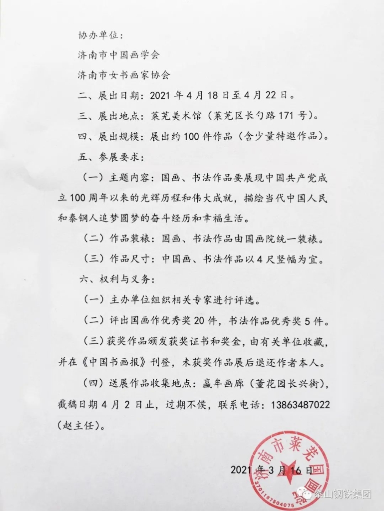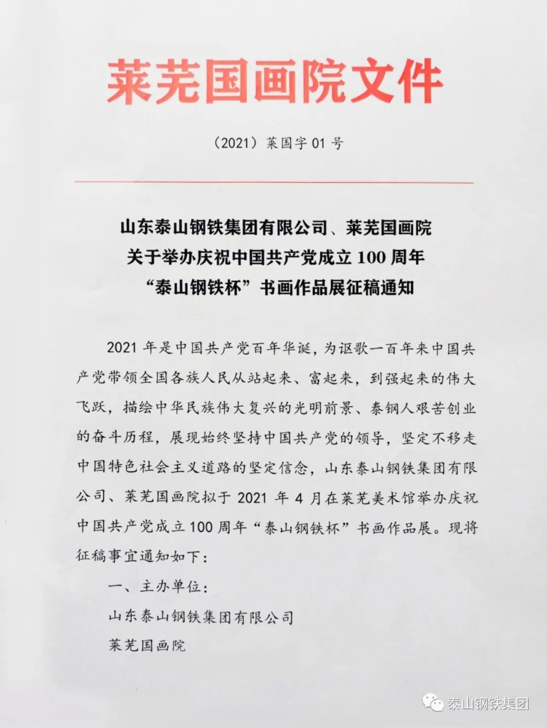 由泰山钢铁集团、莱芜国画院联合举办的庆祝中国共产党成立100周年“泰山钢铁杯”书画作品展开始向社会公开征稿!