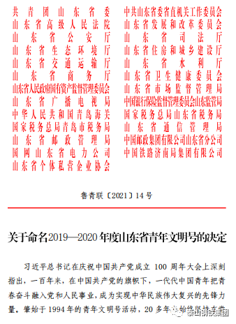 为选树典型、表扬先进,共青团山东省委、中共山东省委省直机关工作委员会等 25 家省创建青年文明号活动组委会成员单位联合下发《关于命名2019—2020 年度山东省青年文明号的决定》,授予符合创建条件且表现突出的282 个创建集体为“2019—2020 年度山东省青年文明号”,泰山钢铁集团冷轧部电工班榜上有名。