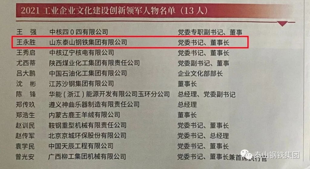 近日,中国工业新闻网及中国工业报刊登了“2021工业欧宝app登录入口建设创新示范单位及创新人物、成果”名单,泰山钢铁集团荣获“2021年工业欧宝app登录入口建设创新示范单位”称号,集团党委书记、董事长、总裁王永胜荣获“2021工业欧宝app登录入口建设创新领军人物”称号。