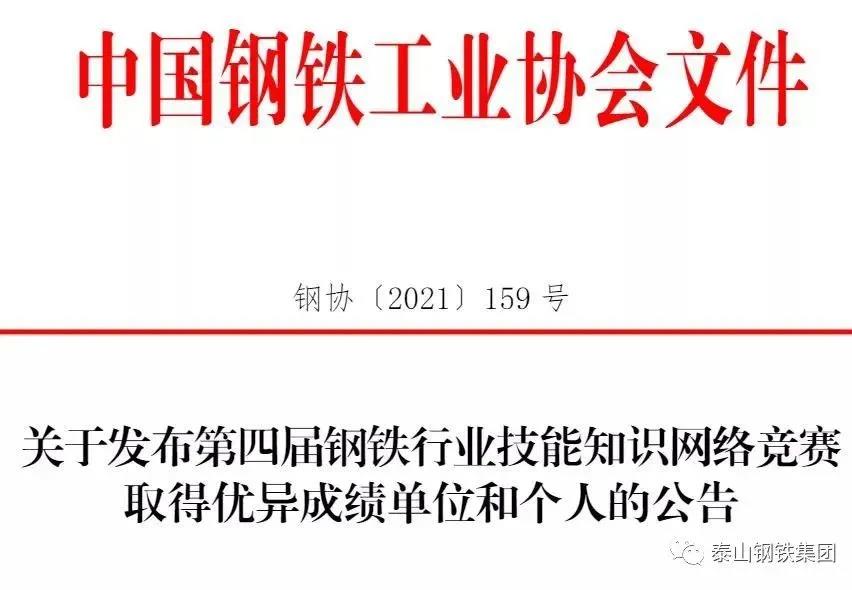 中国钢铁工业协会下发《关于发布第四届钢铁行业技能知识网络竞赛取得优异成绩单位和个人的公告》,表扬了一批优胜团体、先进个人。其中,集团公司荣获“优秀组织单位”荣誉称号,集团职工刘金宏、刘权、亓亮荣获“钢铁行业学技能知识标兵”称号。