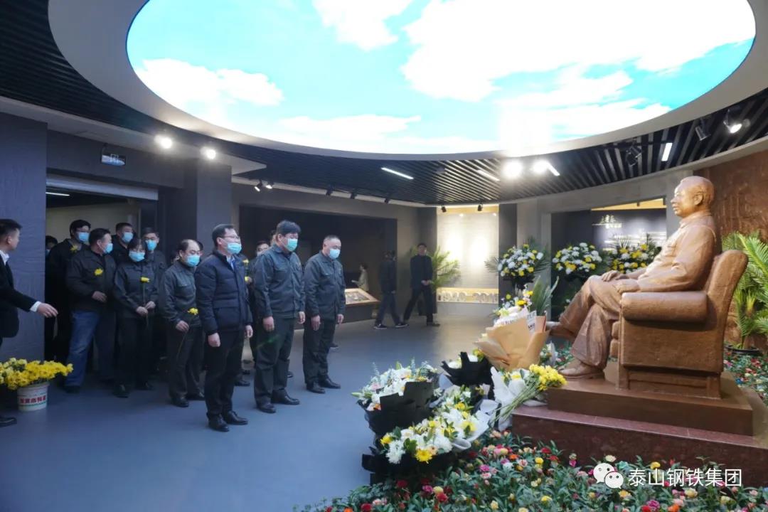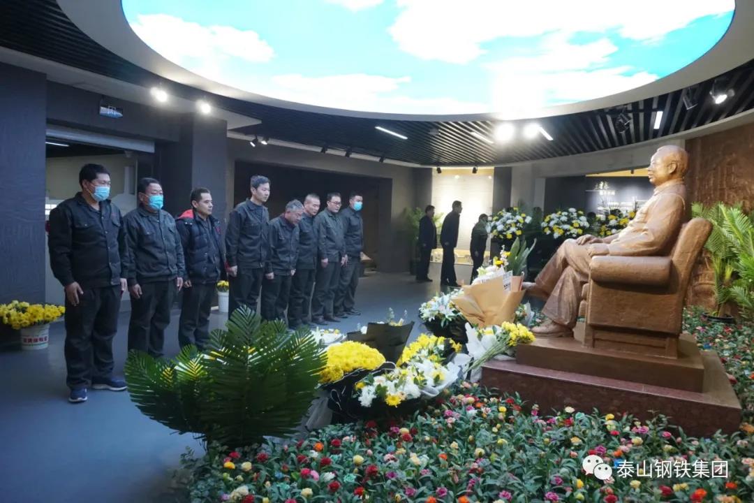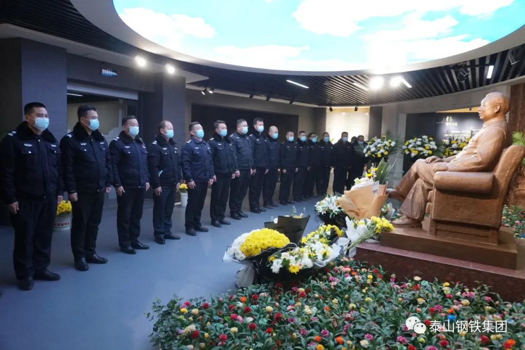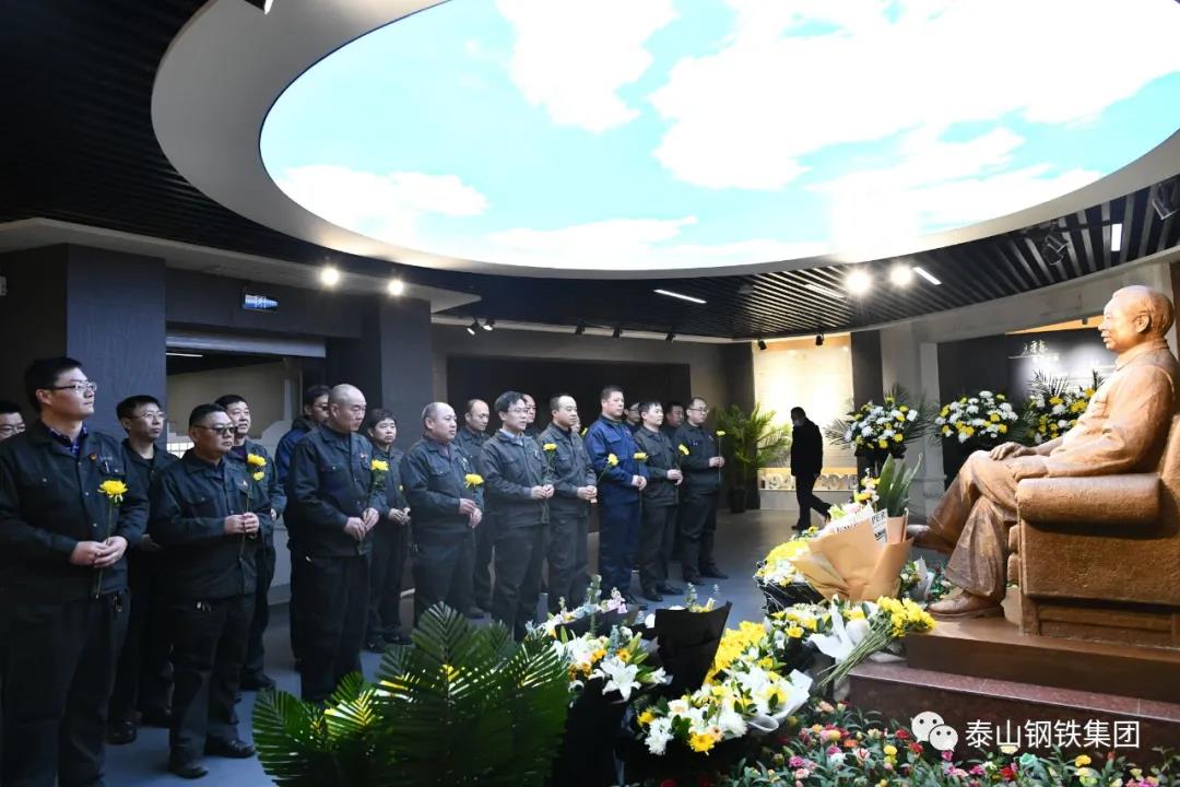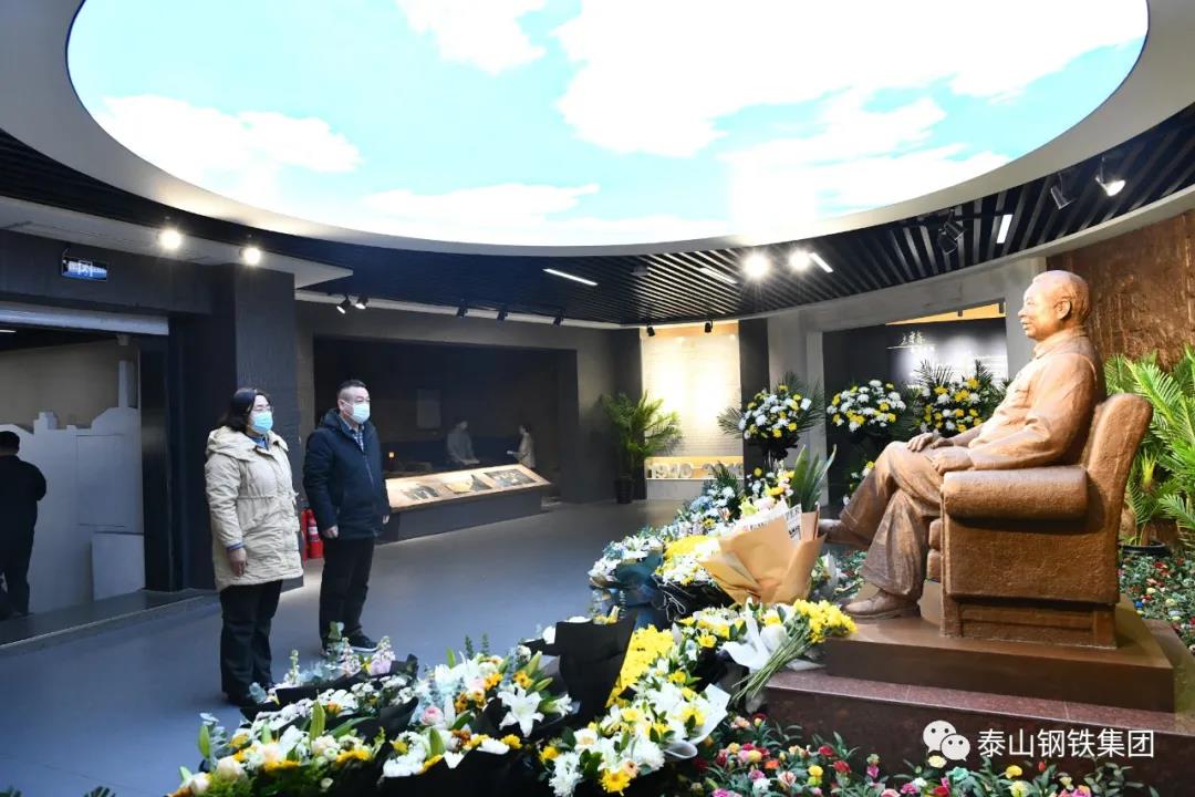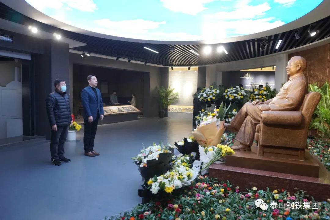 2022年1月1日上午9时,泰山钢铁集团党委书记、董事长、总裁王永胜带领在家公司领导一起拾级而上,缓步走进庄严肃穆的老书记纪念馆,向老书记雕像敬献鲜花。鲜艳挺拔的花烛、芬芳吐蕊的百合、轻盈绽放的文心兰,寄托着对已故老书记王守东同志的深切缅怀和崇高敬意。