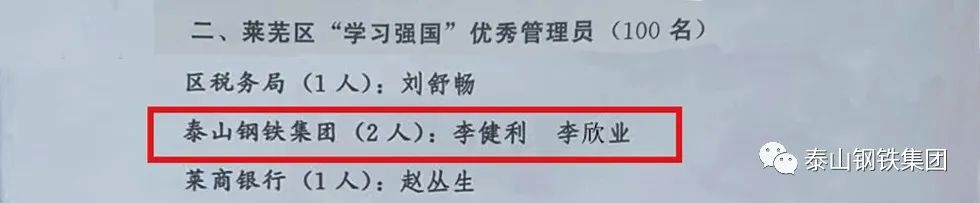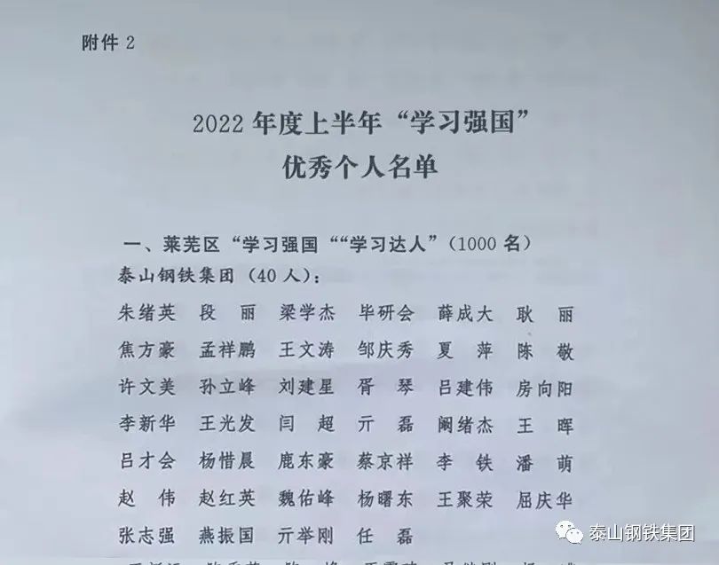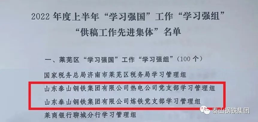 近日,济南市莱芜区委宣传部下发《关于表扬济南市莱芜区2022年上半年“学习强国”先进集体和优秀个人的通报》文件,对120个先进集体、1130名优秀个人进行通报表扬。其中,泰山钢铁集团热电公司党支部学习管理组、炼铁党支部学习管理组荣获莱芜区“学习强国”工作“学习强组”荣誉称号,职工朱绪英等40人荣获莱芜区“学习强国”“学习达人”荣誉称号,职工李健利、李欣业荣获莱芜区“学习强国”优秀管理员荣誉称号。