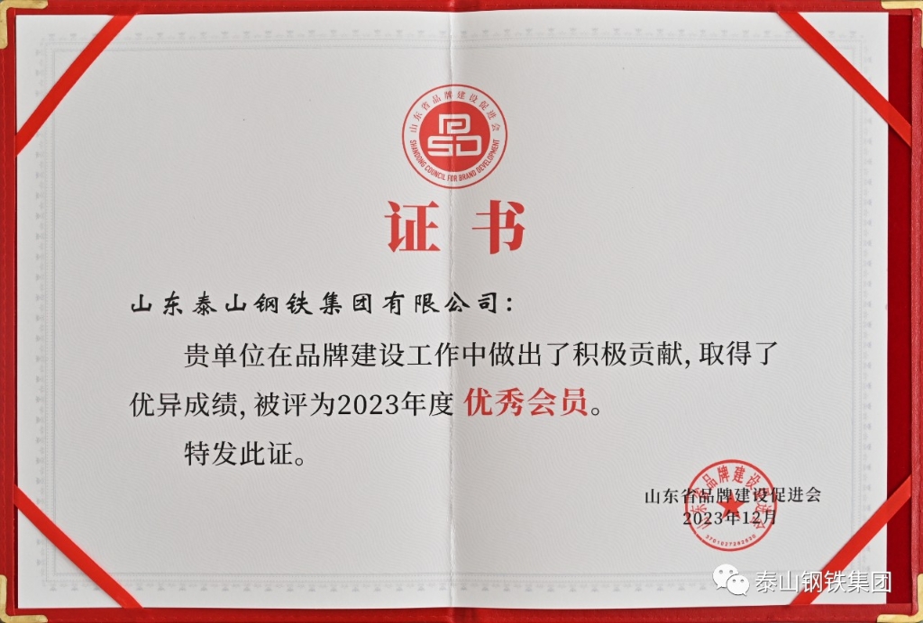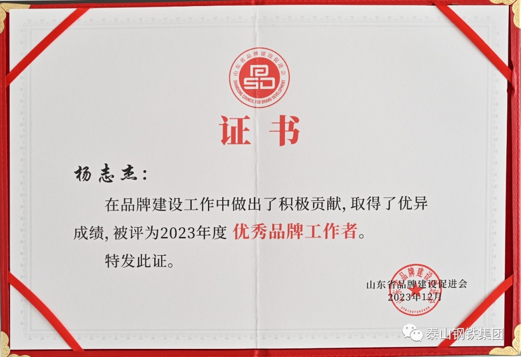 泰山钢铁集团被评为“山东省品牌建设优秀会员单位”,“欧宝app登录入口-欧宝(中国)品牌的创建和发展”被评为“品牌建设优秀案例”,职工杨志杰被评为“优秀品牌工作者”。