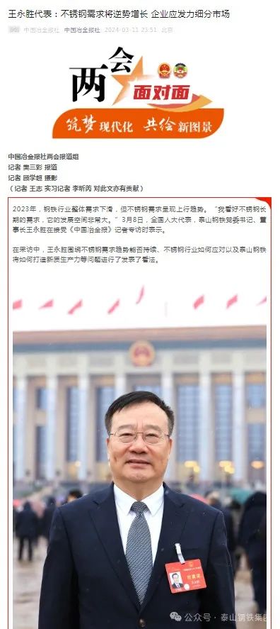 此外,在接受中国冶金报记者采访时,王董事长围绕“不锈钢需求趋势能否持续”、“不锈钢行业如何应对”、”泰山钢铁将如何打造新质生产力”等问题畅谈了看法。