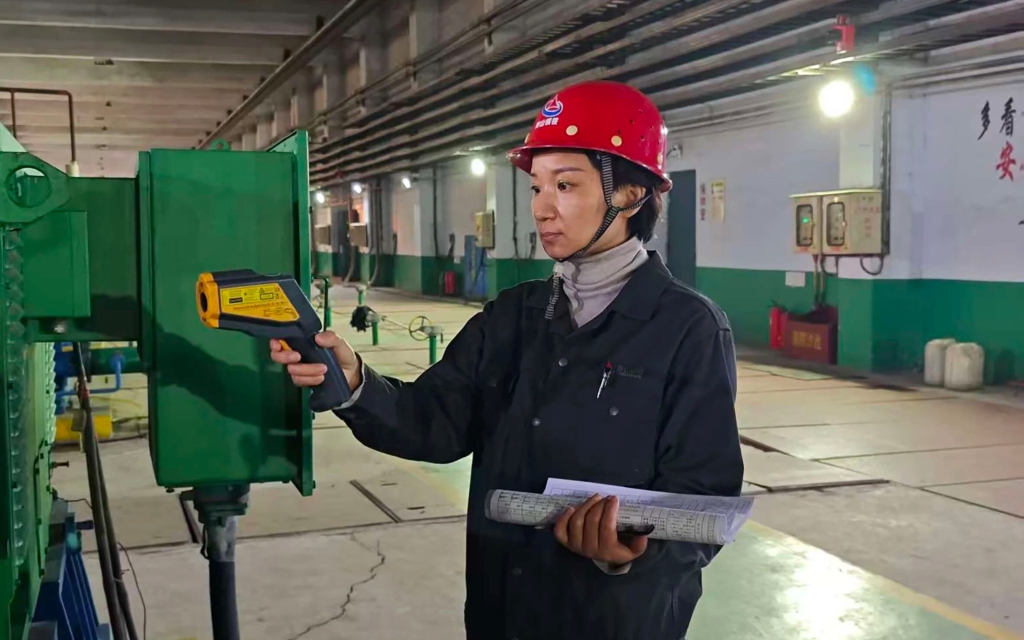 泵房内,巨大的水泵昼夜不息地高速运转,轰鸣声震耳欲聋。但屈庆华早已对这样的嘈杂产生“免疫”。在她眼里,这些相伴多年的设备就像“老伙计”一般熟悉,她总能精准捕捉每一个细微的“不和谐音”。检查压力稳定性、观察水位是否达标、监测设备温度变化……这套流程她已重复了二十多年,纵然早已烂熟于心,她却从未有一丝懈怠。巡检途中,她时而侧耳倾听设备运转声,时而伸手触摸泵体感受振动频率,时而俯身查看压力表数值,时而用测温枪测量电机与泵体温度,与此同时,每一项数据都被认真记录。“咱们这儿差一毫,高炉那边就可能差一大截,决不能出半点岔子。”这是她常挂在嘴边的话,更是刻在心底的责任。